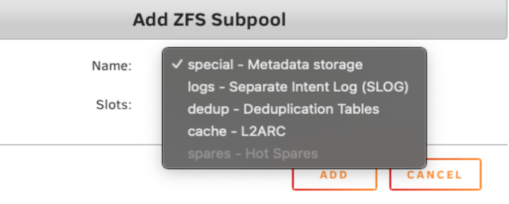 Unraid bezeichnet ZFS-Unterstützungs-vdevs als Subpools. Die meisten Benutzer benötigen diese nicht, aber fortgeschrittene Benutzer könnten ihnen begegnen: